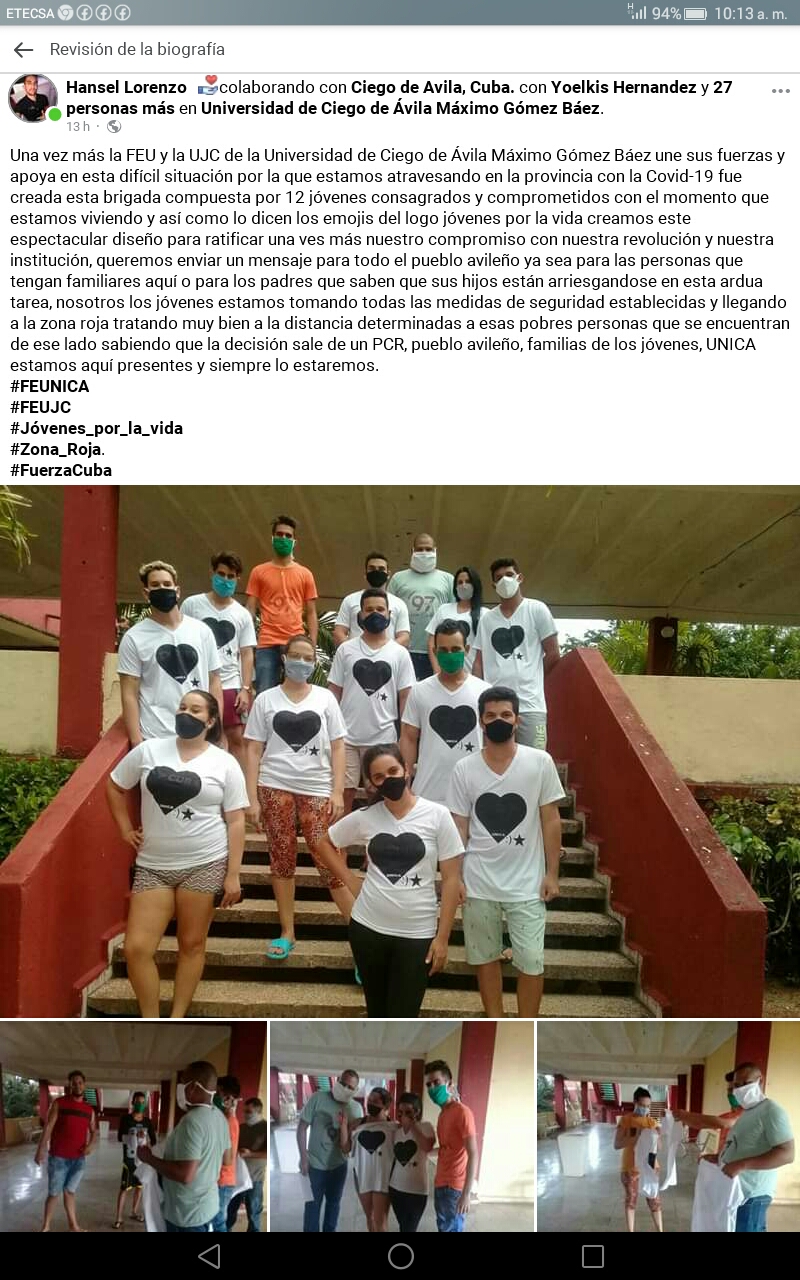 Nos cuenta también Hansel que además de la tropa de los 12,de manera diaria cuarenta jóvenes del municipio Ciego de Ávila viajarán en transporte universitario hasta la UNICA para trabajar en la limpieza de las facultades y locales ,en franca colaboración con el personal de servicios, encomienda necesaria ,en días en los que solidaridad es palabra de orden. Como la FEU está en todas partes ,desde este 9 de septiembre se reactiva el Contigente 97 años con Cuba,que emprenderá labores de mensajería, atención al Adulto Mayor y a poblaciones de riesgo, así como otras que defina el Consejo de Defensa provincial.